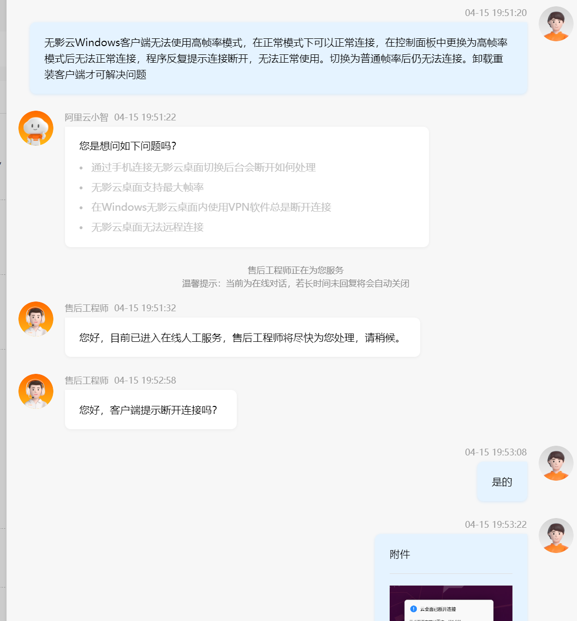 首先是遇到了显示相关问题:在我尝试开启高帧率模式时远程视频会卡死,并且切换回普通帧率后仍然无法解决问题。我创建了后台工单请求解决