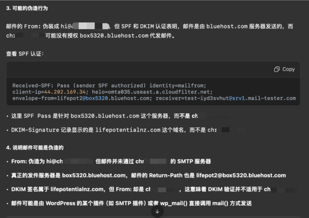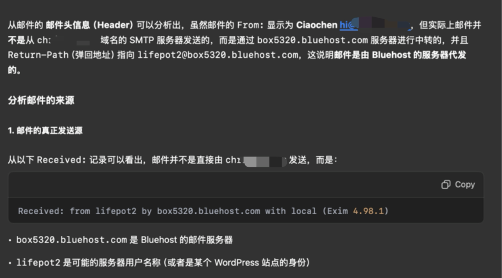 然后,我将分析信息复制给 ChatGPT 让其为我分析邮件元信息: