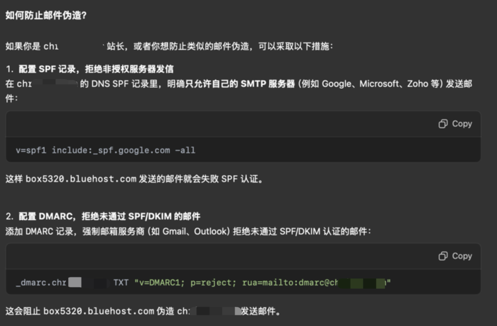 到此,我已经几乎理解了这封“伪造邮件”的来龙去脉和他能被成功发出的原因。接下来,我尝试着手解决这一问题,chatgpt给了我以下解决方案