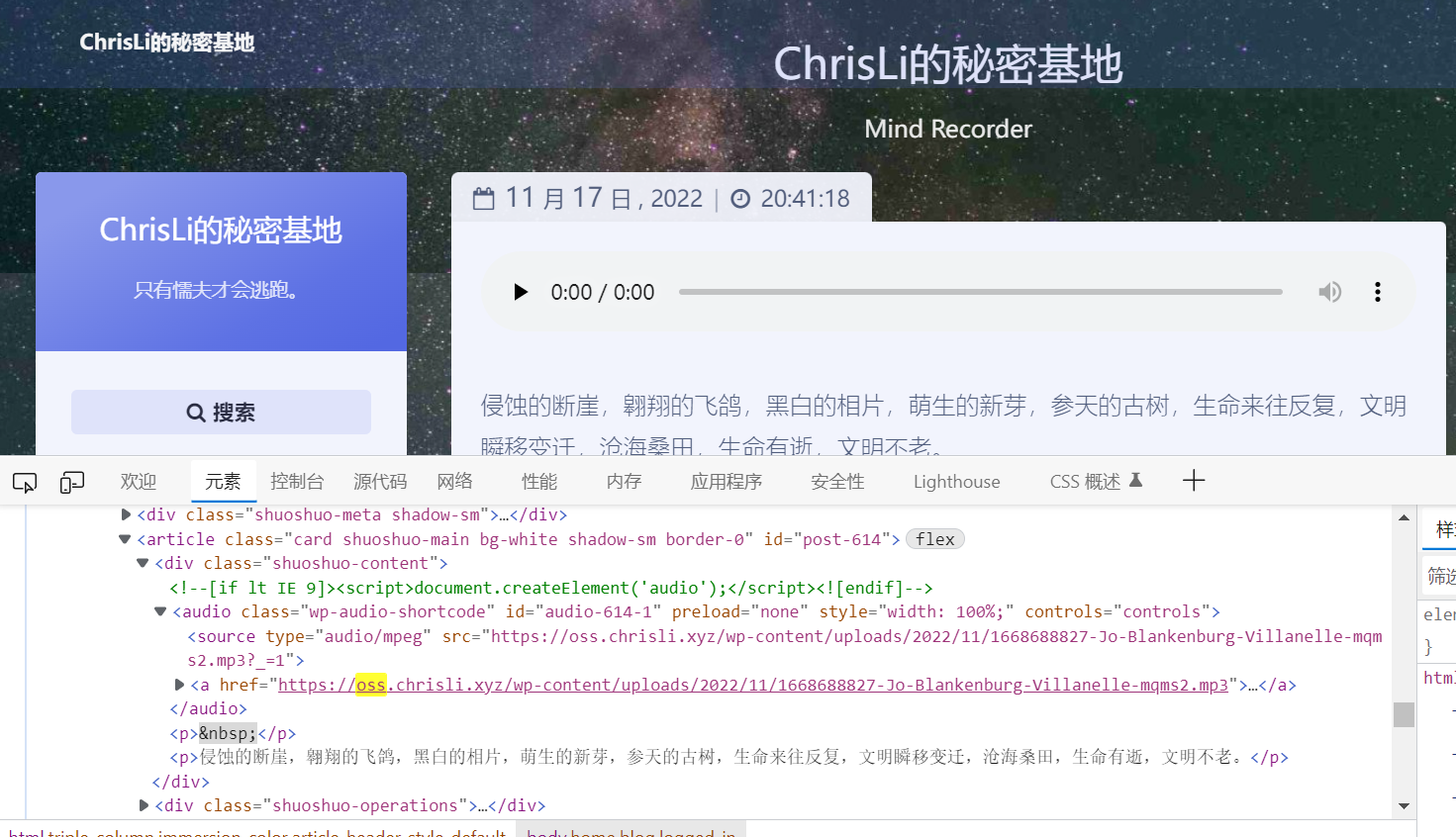 如果您点击键盘上的F12按钮查看HTML源代码,可以发现网页中的媒体文件全部链接到了chrisli.xyz的子域名:oss.chrisli.xyz,使用