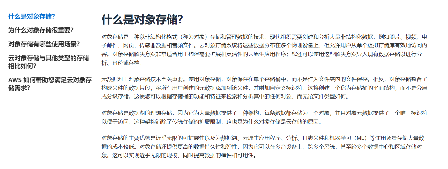 对象存储?- 对象存储 - AWS (amazon.com) https://aws.amazon.com/cn/what-is/object-storage/