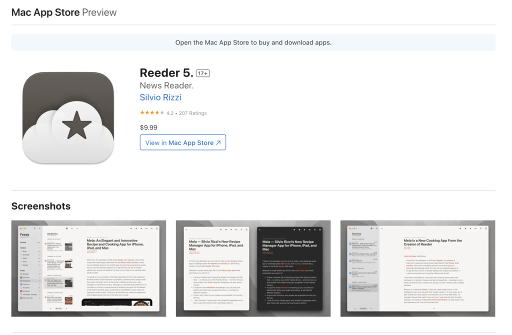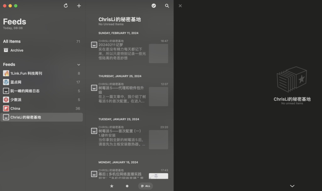 在 macOS 和 iOS 上,我使用 Reeder5 作为RSS订阅工具。此工具支持 iCloud 同步,可以将相同 iCloud 账号下的订阅地址进行同步。