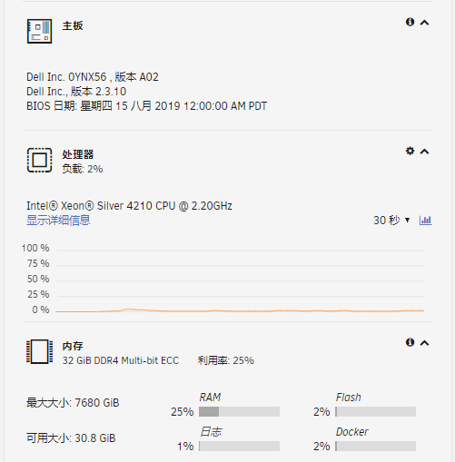 首先介绍服务器配置:戴尔机架式R740服务器,CPU为银牌4210,10核心20线程,32G ECC内存。对于后期的虚拟机多开十分具有优势
