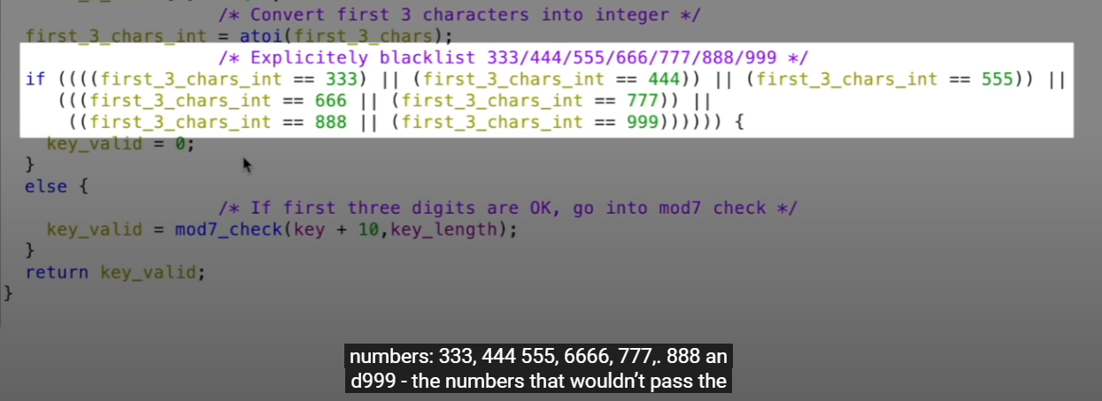 key_length = LSTRLEN(key); if ((((key_length == 0x17) && (key[5] == '-')) && (key[9] == '-')) && ((key[0x11] == '-' && (is_oem = check_oem_str(3,0x11704f9d,key + 6,len), is_oem == 0)))) { /* Check first 5 digits, must be numeric */ i = 0; do { kc = key[i]; if (kc < '0') { return 0; } if ('9' < kc) { return 0; } i = i + 1; } while (i < 5); /* */ copy_partial(3,key,len,first_three_digits); first_three_digits[3] = '\0'; first_3_digits_int = atoi(first_three_digits); if ((first_3_digits_int != 0) && (first_3_digits_int < 367 /* check if between 1 and 366 */)) { copy_partial(2,key + 3,len,second_two_digits); second_two_digits[2] = '\0'; second_2_digits_int = atoi(second_two_digits); if (((second_2_digits_int < 3) || (94 < second_2_digits_int)) && (((key[10] == '0' && ('0' < key[0x10])) && (key[0x10] < '8')))) { i_ = 0x12; while ((kc = key[i_], '/' < kc && (kc < ':'))) { i_ = i_ + 1; if (0x16 < i_) { /* jump to part after oem- */ check_result = mod7_check(key + 10,len); return check_result; } } } } } return 0;}代码源地址:https://gist.github.com/nezza/a25bee13f25a1733a4c7a1d3d1cf5882