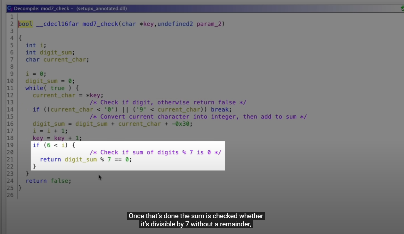余下的七位数字则会将各个数位的数字求和,并验证其与7的整除性。若Sum能被7整除(不留余数),程序即判定为序列号有效,验证通过。